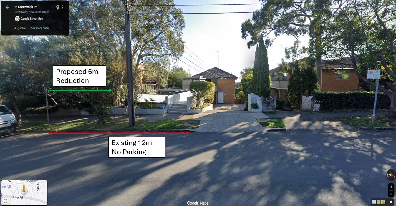 Council proposes to reduce the existing ‘No Parking’ restriction from 12 metres to 6 metres directly south of the driveway at 23 Greenwich Road.