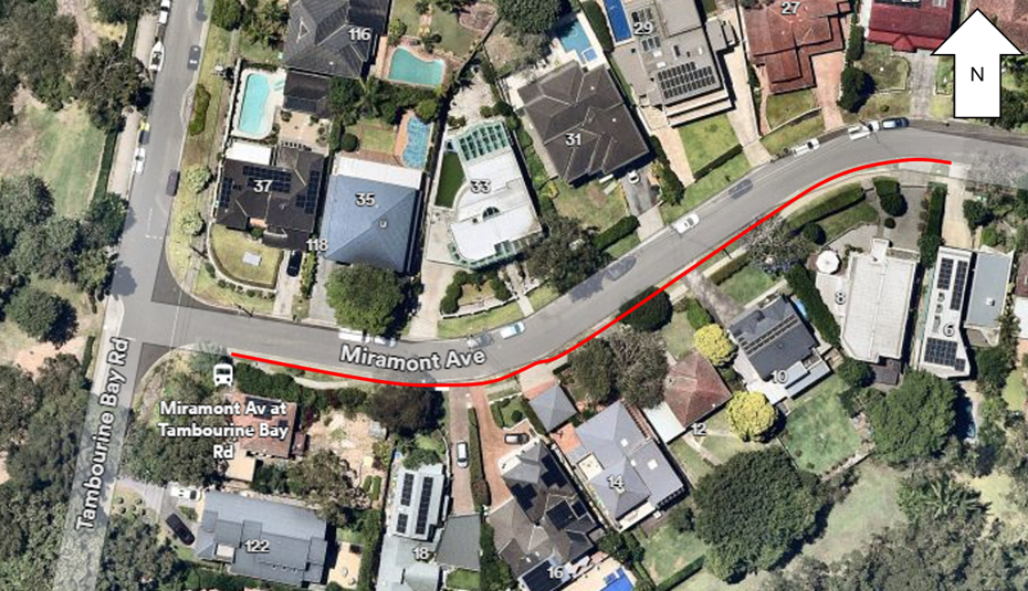 It is proposed to amend the existing No Parking 7am–7pm, Monday to Saturday restriction on the southern side of Miramont Avenue, between No. 6 Miramont Avenue and Tambourine Bay Road, to No Parking at all times.