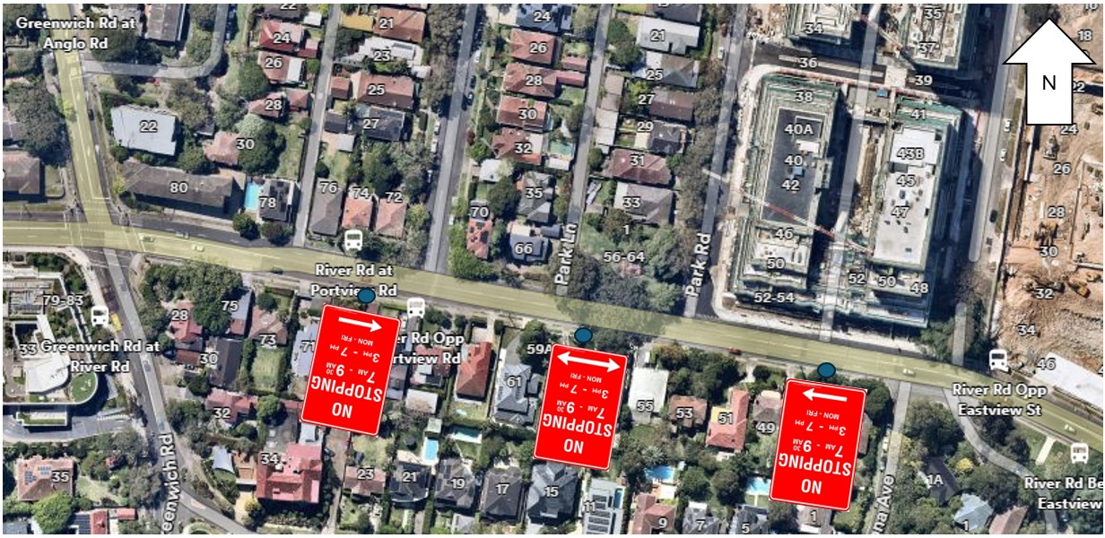 Council proposes to amend the existing ‘No Stopping’ (3PM – 7PM, Mon–Fri) restrictions to ‘No Stopping’ (7AM – 9:30AM and 3PM – 7PM, Mon–Fri) along River Road between Nos. 47 and 71.